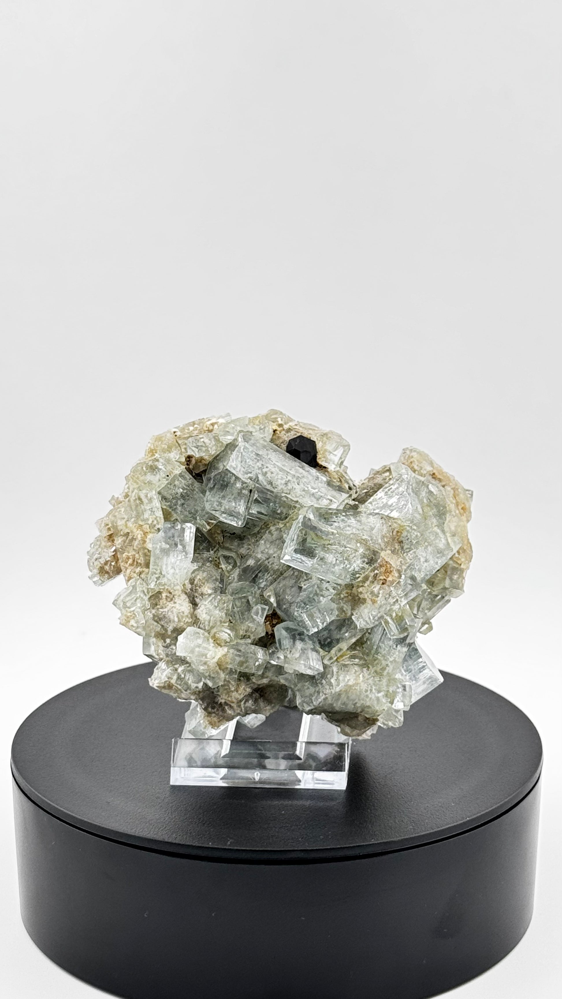 A separate black tourmaline crystal point accentuates the composition and forms an elegant contrast to the bright aquamarine crystals.