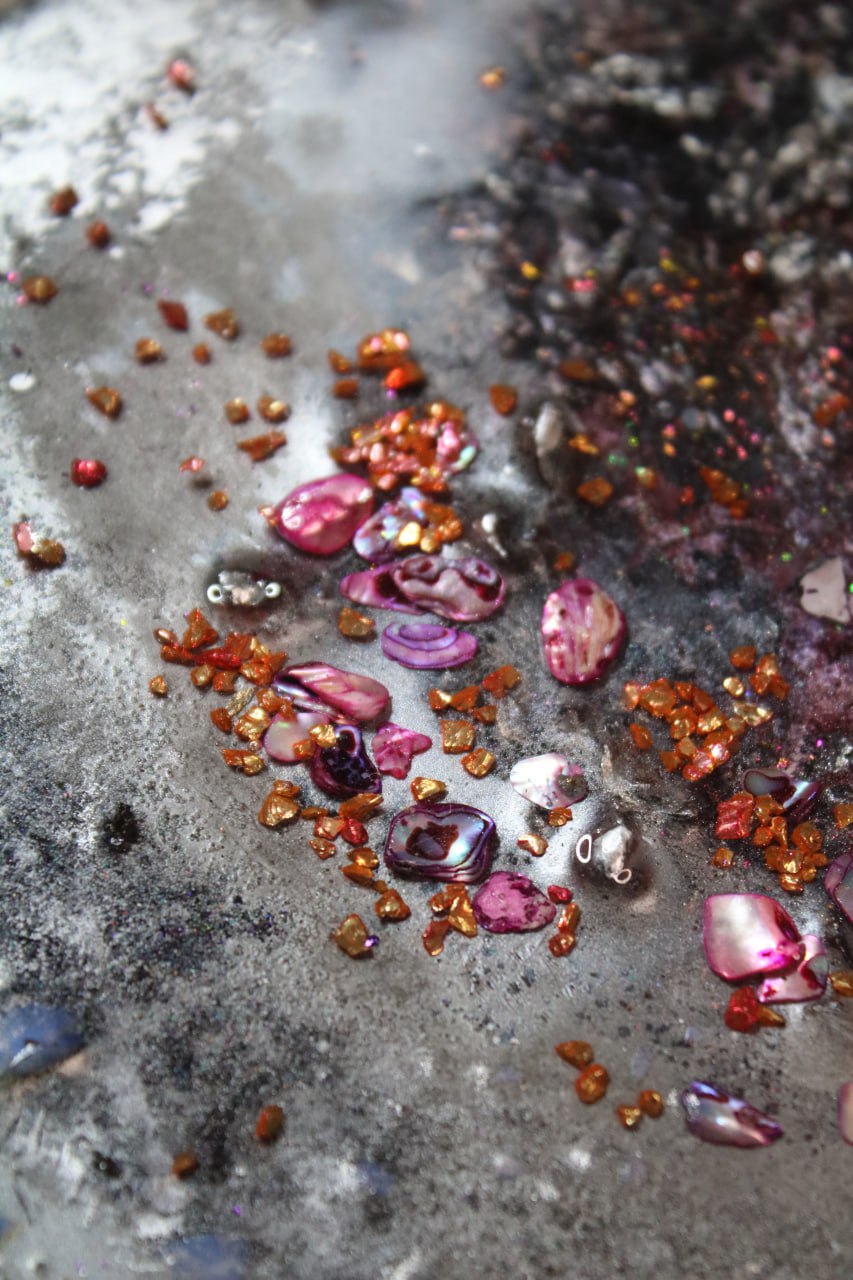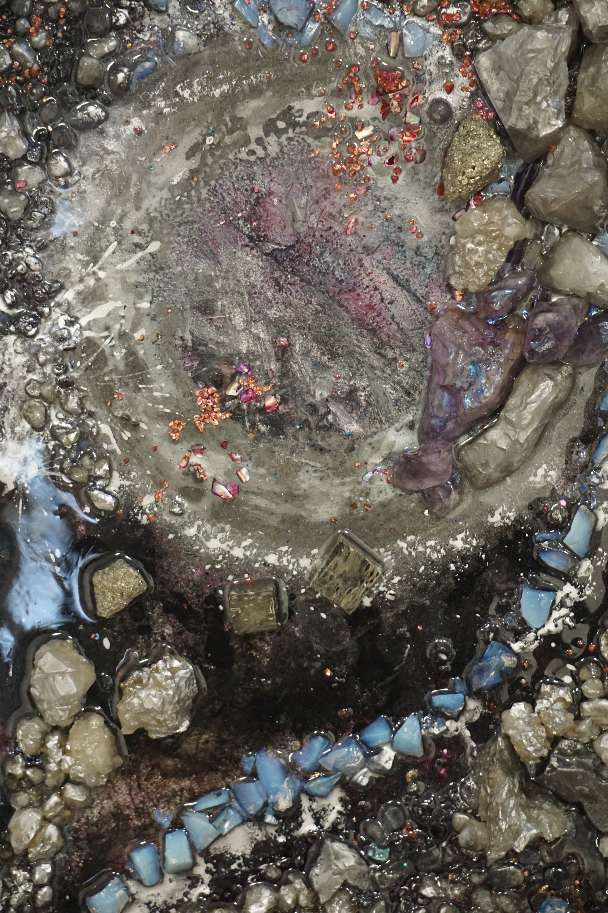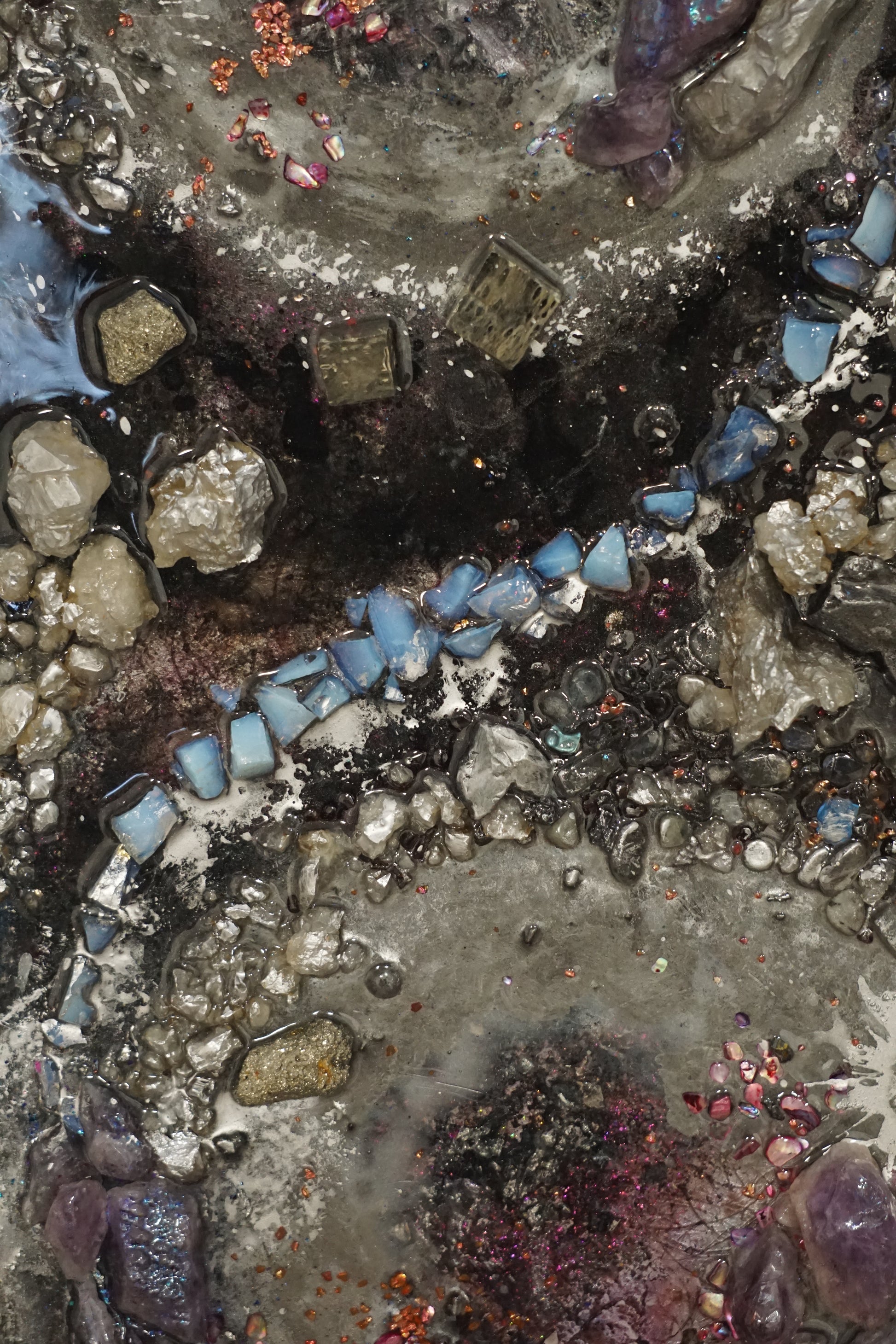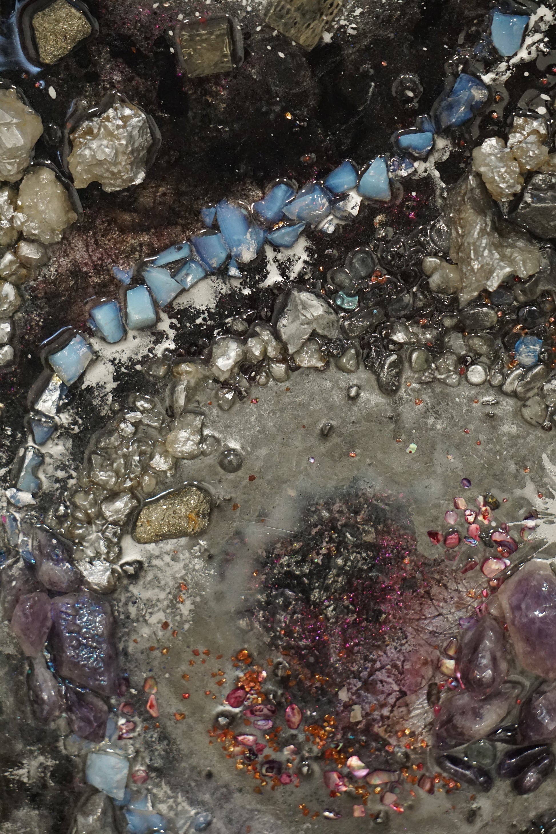 Technique: Epoxy resin, natural crystals (rock crystal, pyrite, lava, moonstone, amethyst, flint, ruby), gold leaf
