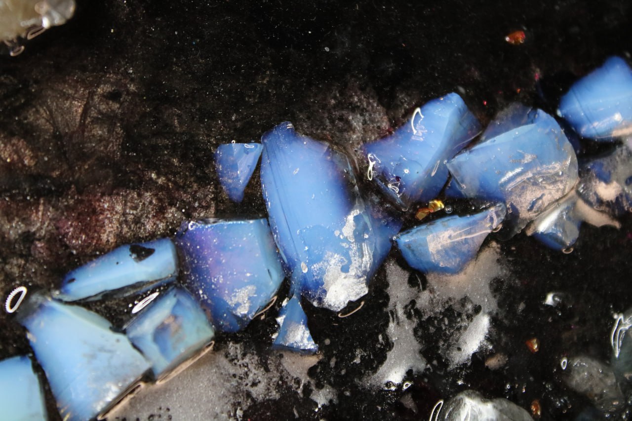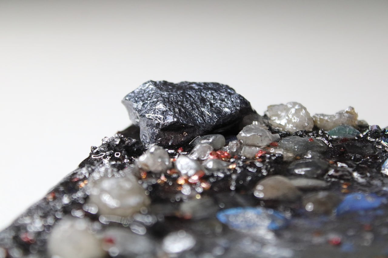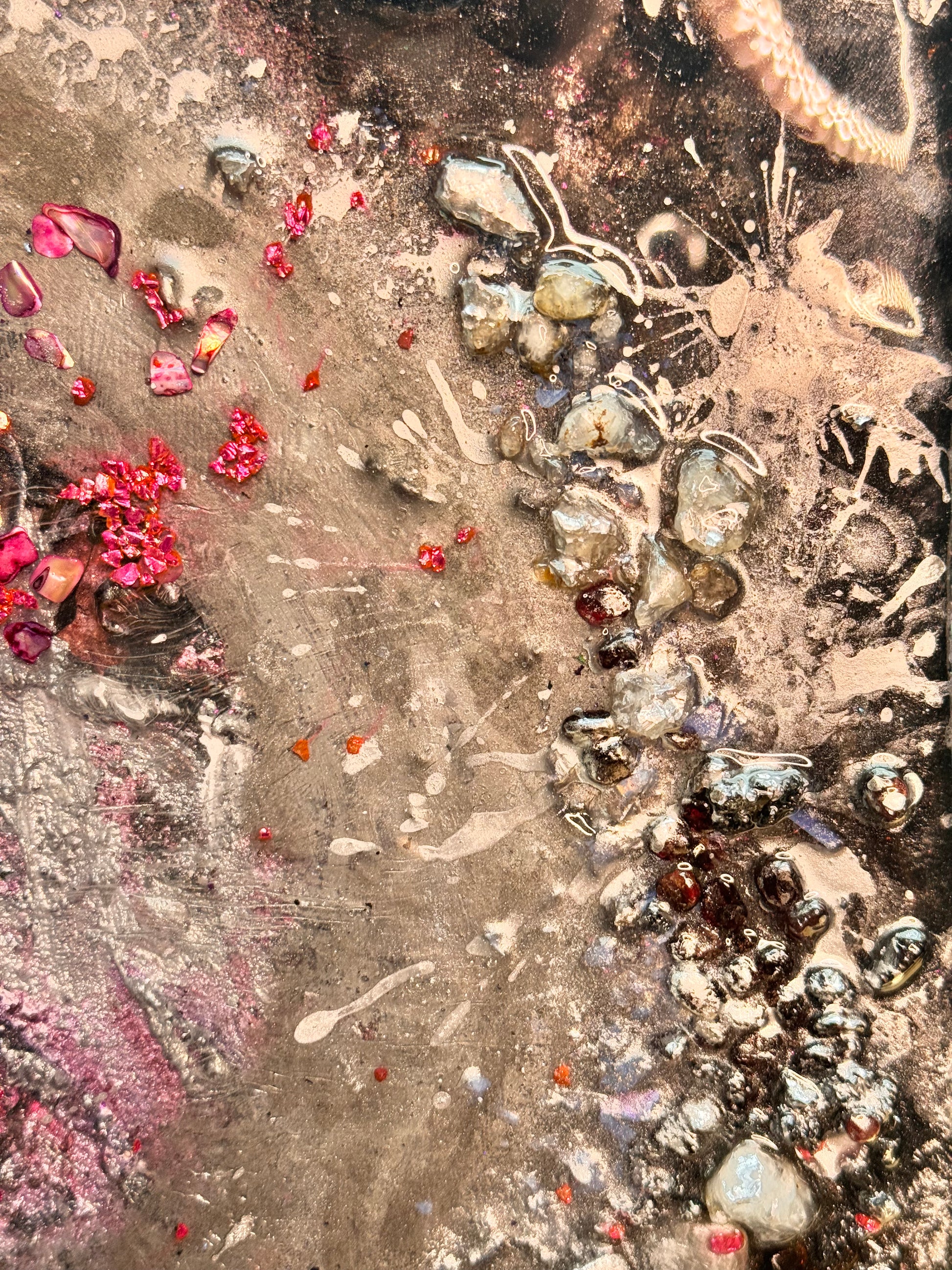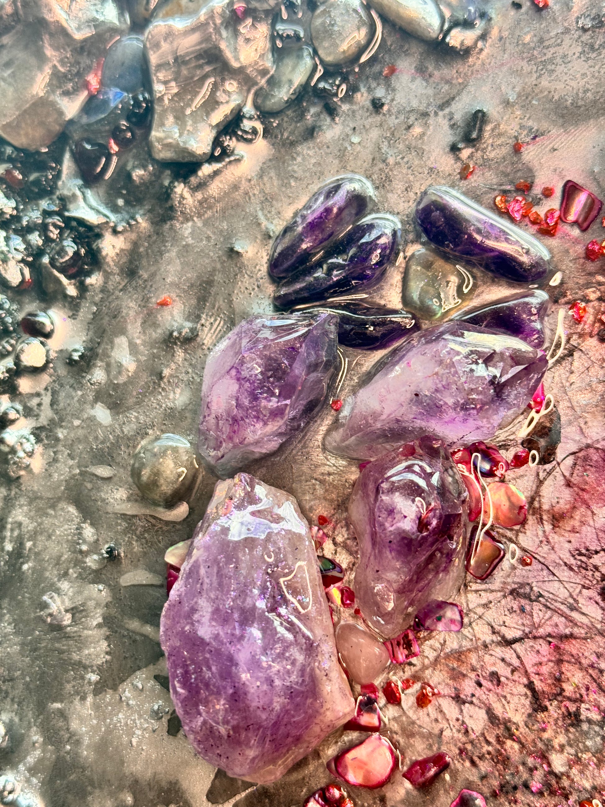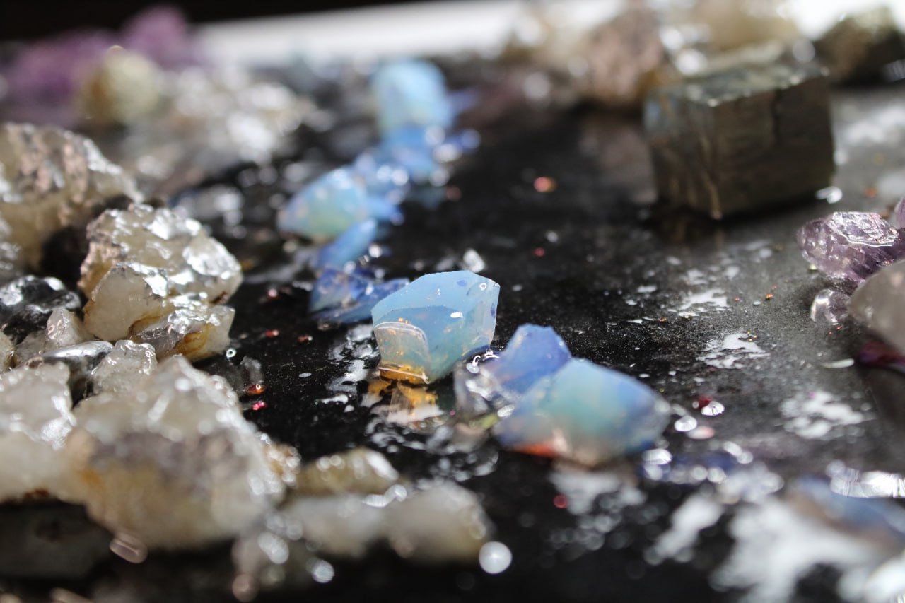 Technique: Epoxy resin, natural crystals (rock crystal, pyrite, lava, moonstone, amethyst, flint, ruby), gold leaf