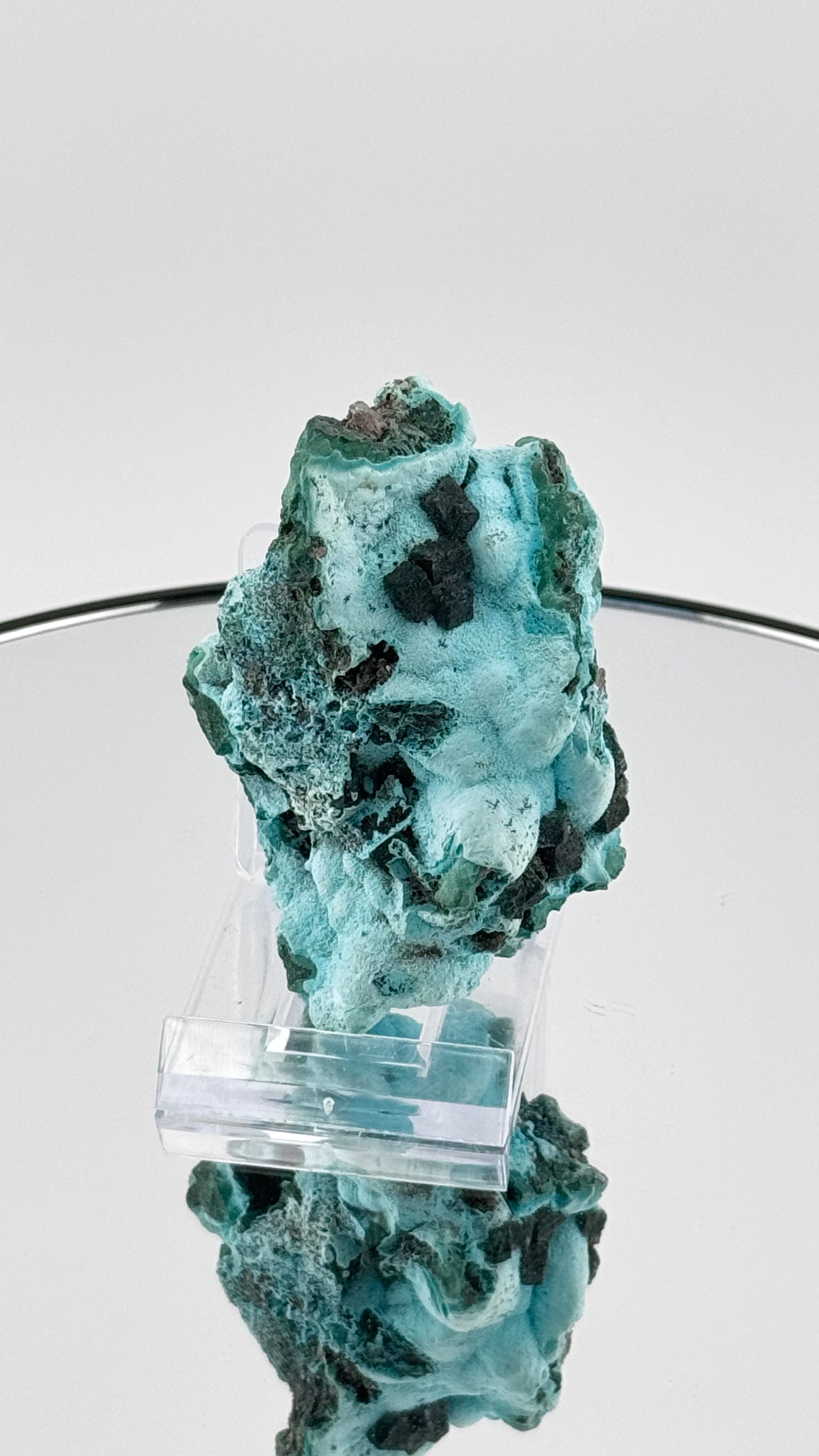 The combination of chrysocolla and dioptase is a rarity even in the mineral-rich Katanga region. Most collections contain either chrysocolla or dioptase – finding both together on one specimen is exceptional. Ideal for collectors of Congolese minerals, lovers of turquoise copper minerals, or as a unique statement piece in a prestigious setting.