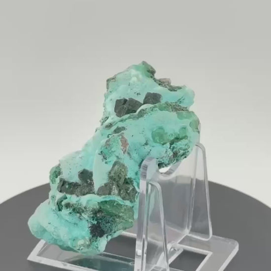 Chrysocolla and dioptase both form in the oxidation zone of copper deposits, but rarely occur together. While chrysocolla, as a hydrous copper silicate, forms amorphous, botryoidal shapes, dioptase crystallizes in perfect, glassy rhombohedrons. This combination makes Congolese specimens mineralogical rarities.
