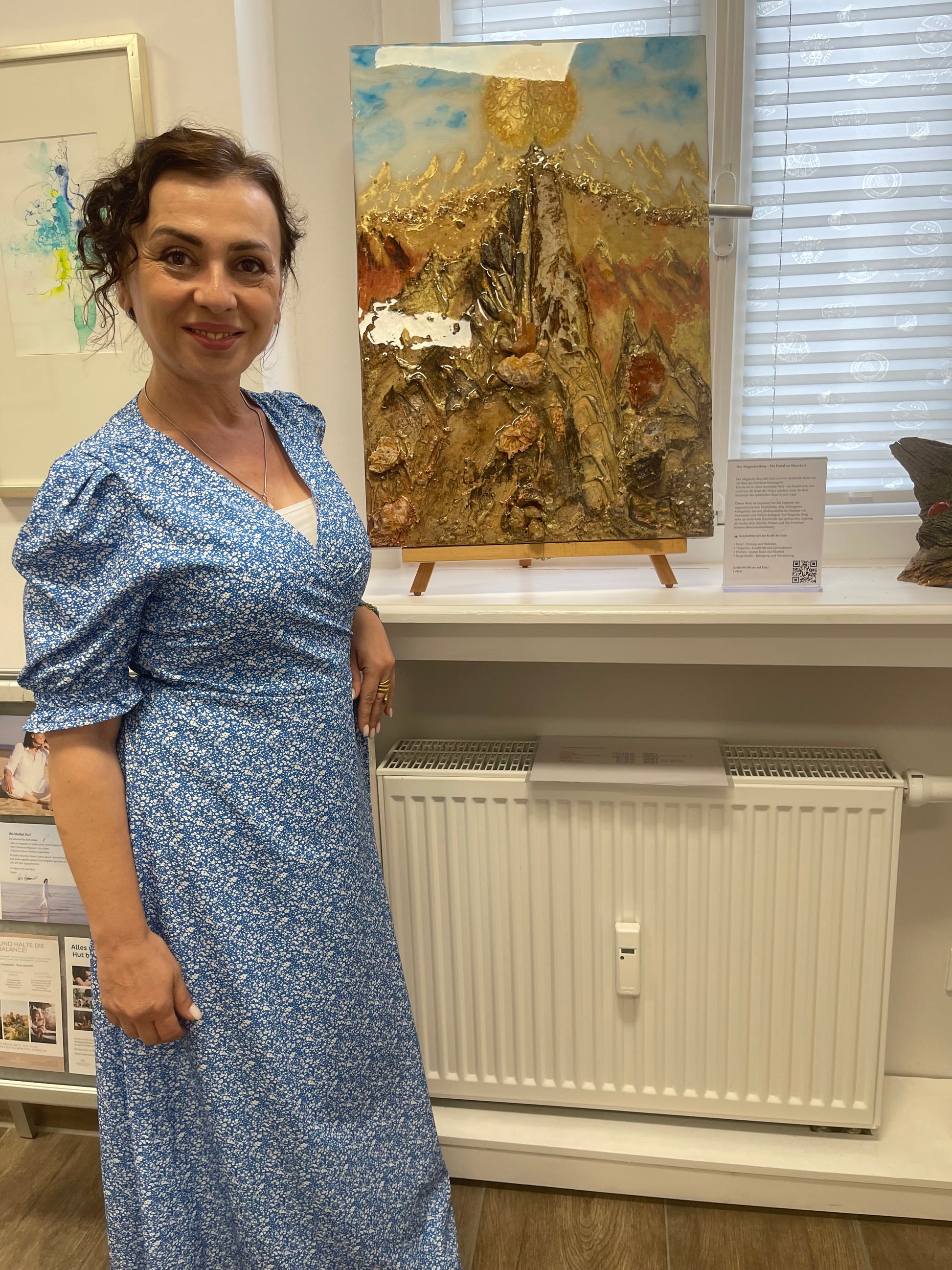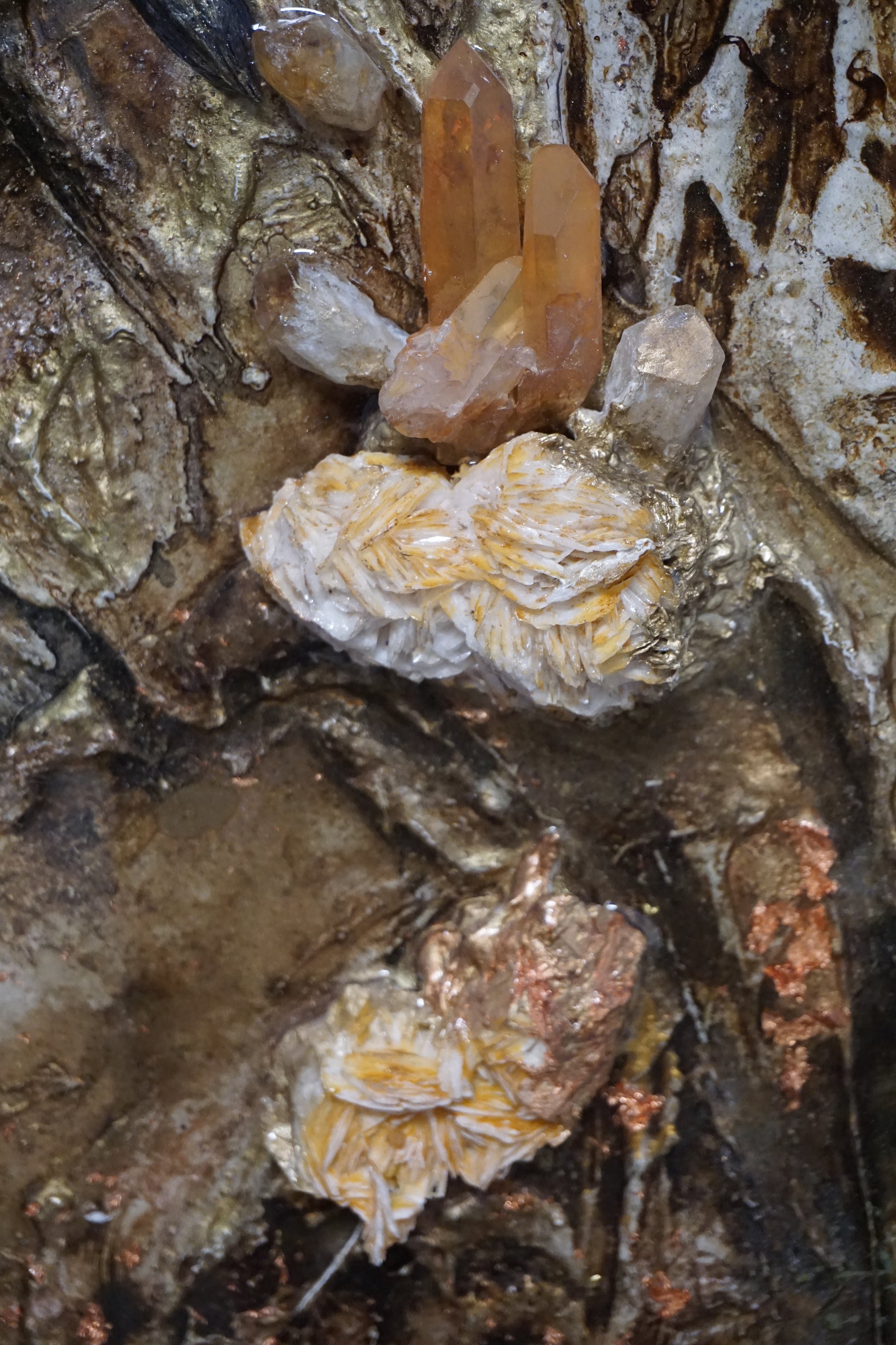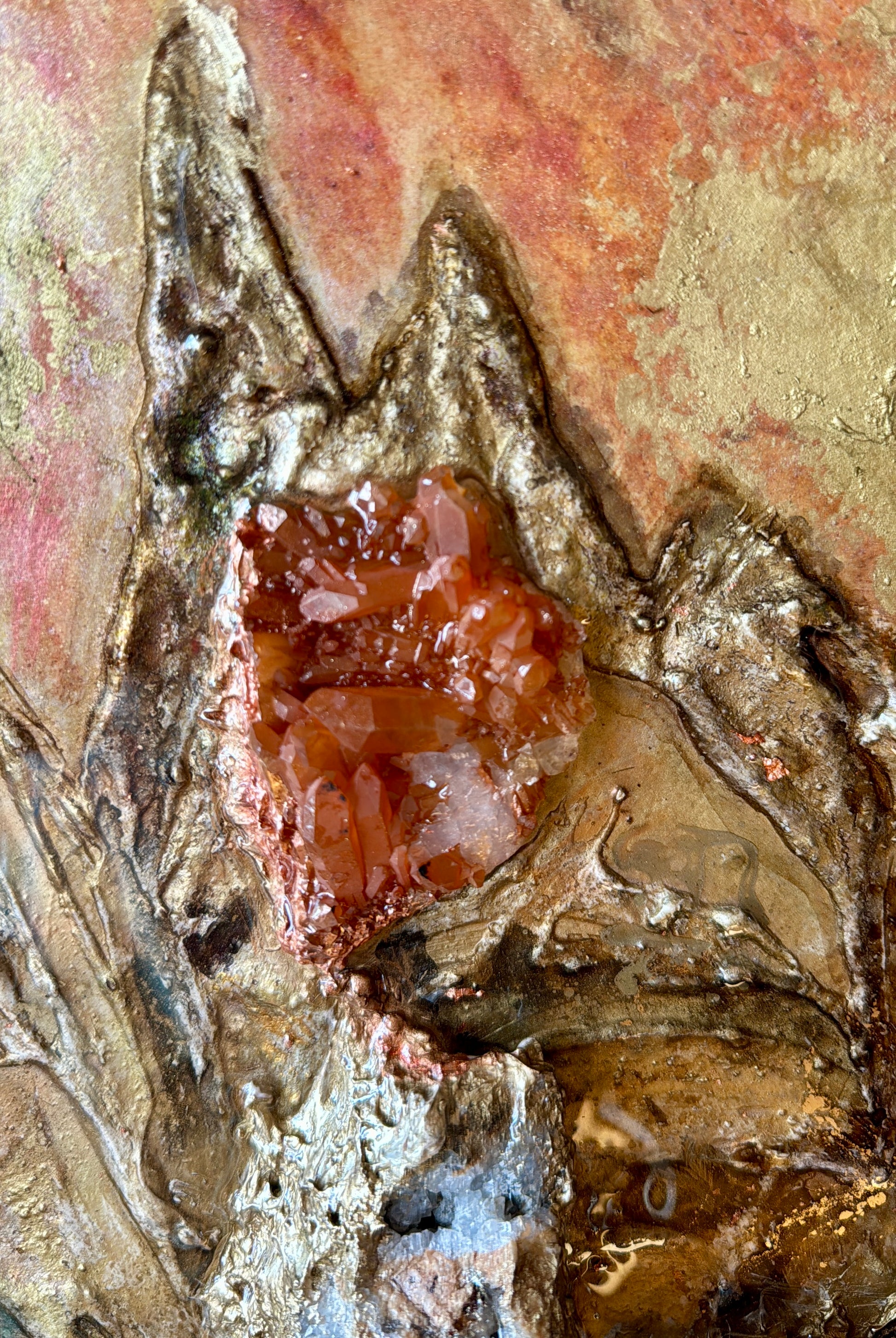The work employs earthy brown, gold, and ochre tones, enhanced by gold leaf accents. The central mountain formation was created using an elaborate layering technique—multiple resin pours with varying viscosities generate a tactile depth and give rise to a geologically inspired landscape. The embedded crystals are not merely decorative but form the "peaks" and "edges" of the composition.