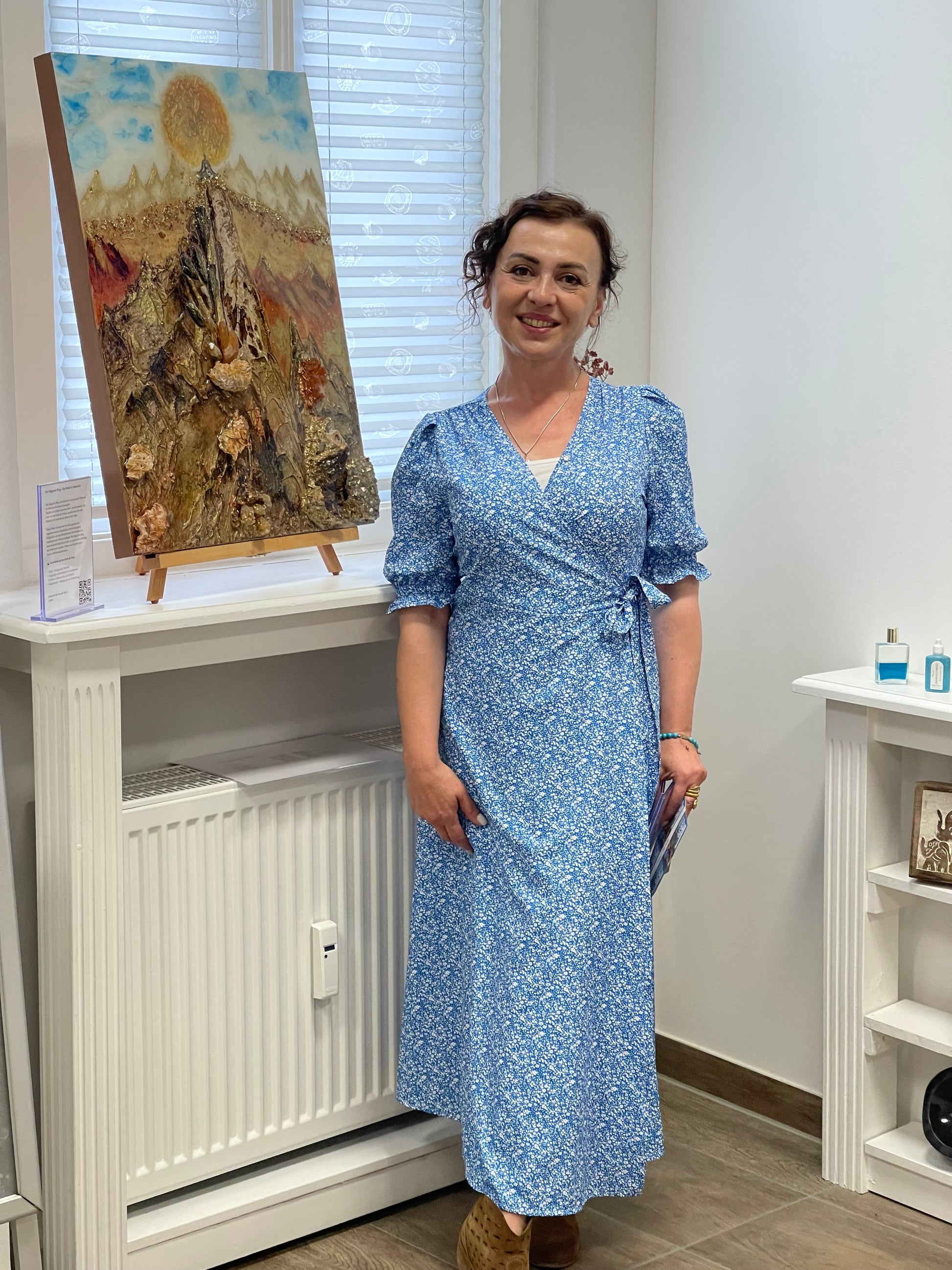 A large-format resin composition featuring a three-dimensional mountain formation as its central motif. Measuring 60 × 80 cm, organic color gradients combine with genuine rock crystals and quartz from the Bergisches Land region, embedded as structural elements in multi-layered epoxy resin.