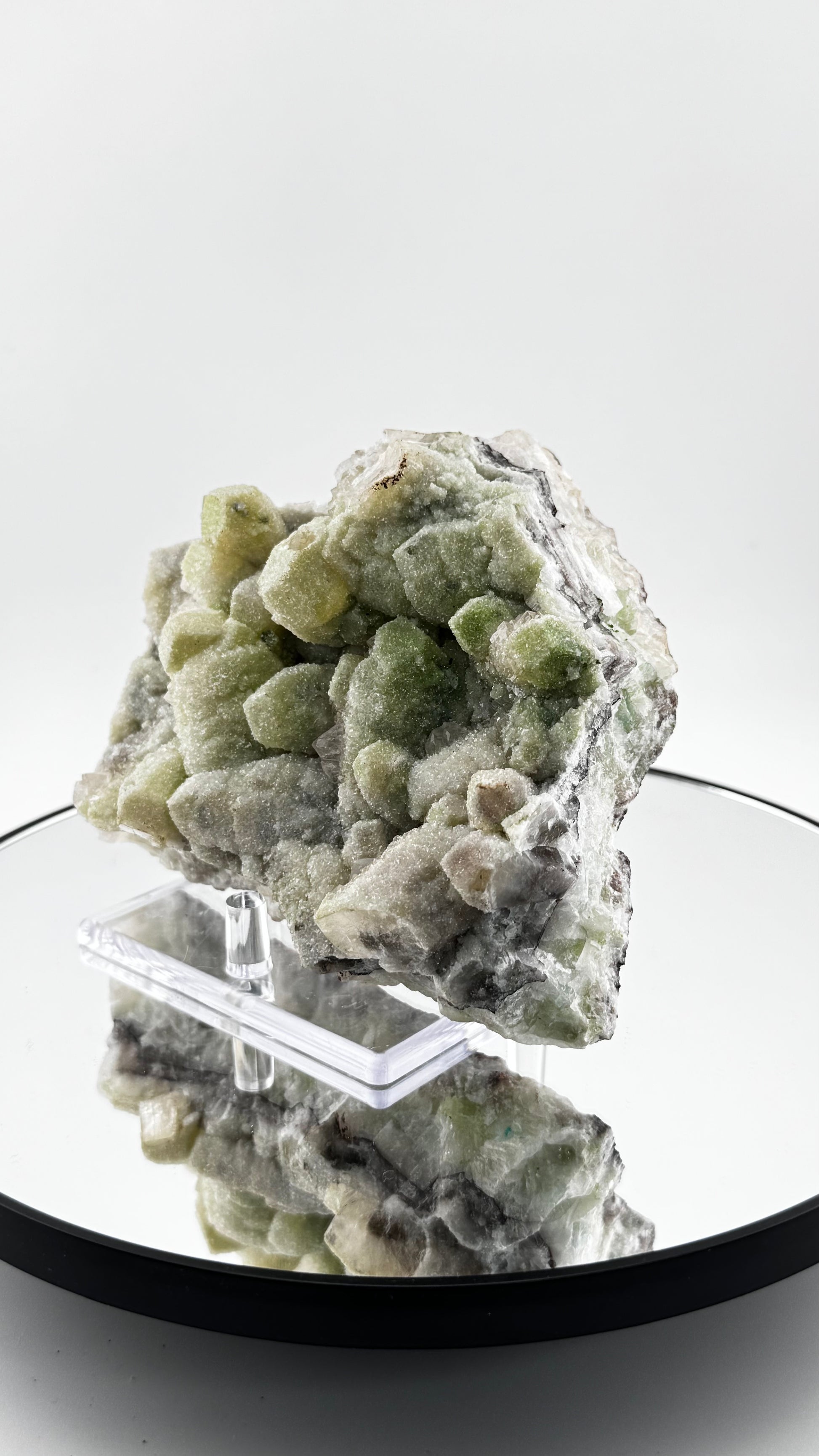 Unter den Duftit-Kugeln wächst eine Matrix aus transparenten bis weißlich-milchigen Calcit-Kristallen, die wie gefrorenes Glas wirken. Der Kontrast zwischen den matten grünen Kugeln und den glänzenden transparenten Calcit-Flächen schafft eine elegante visuelle Spannung.