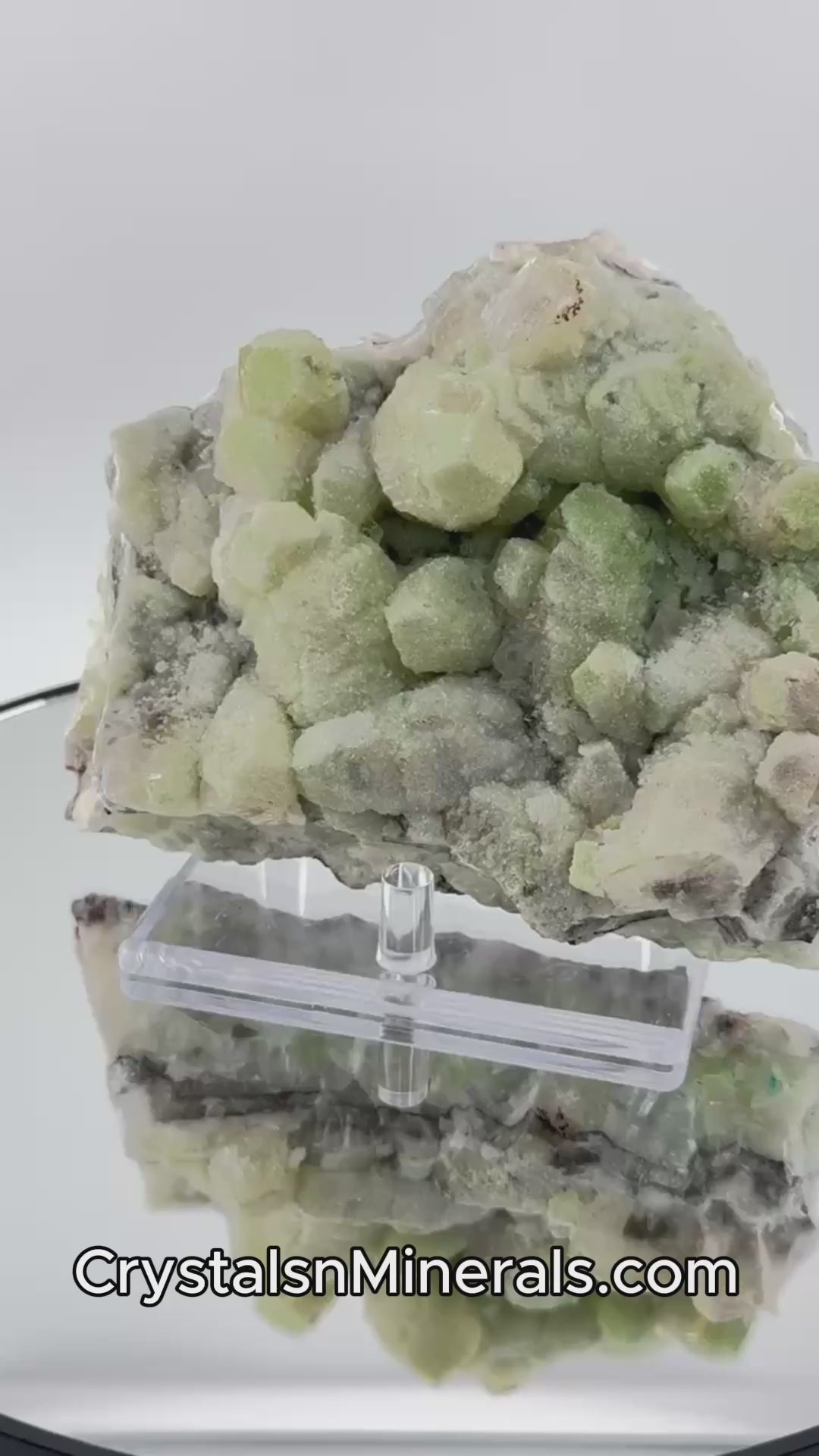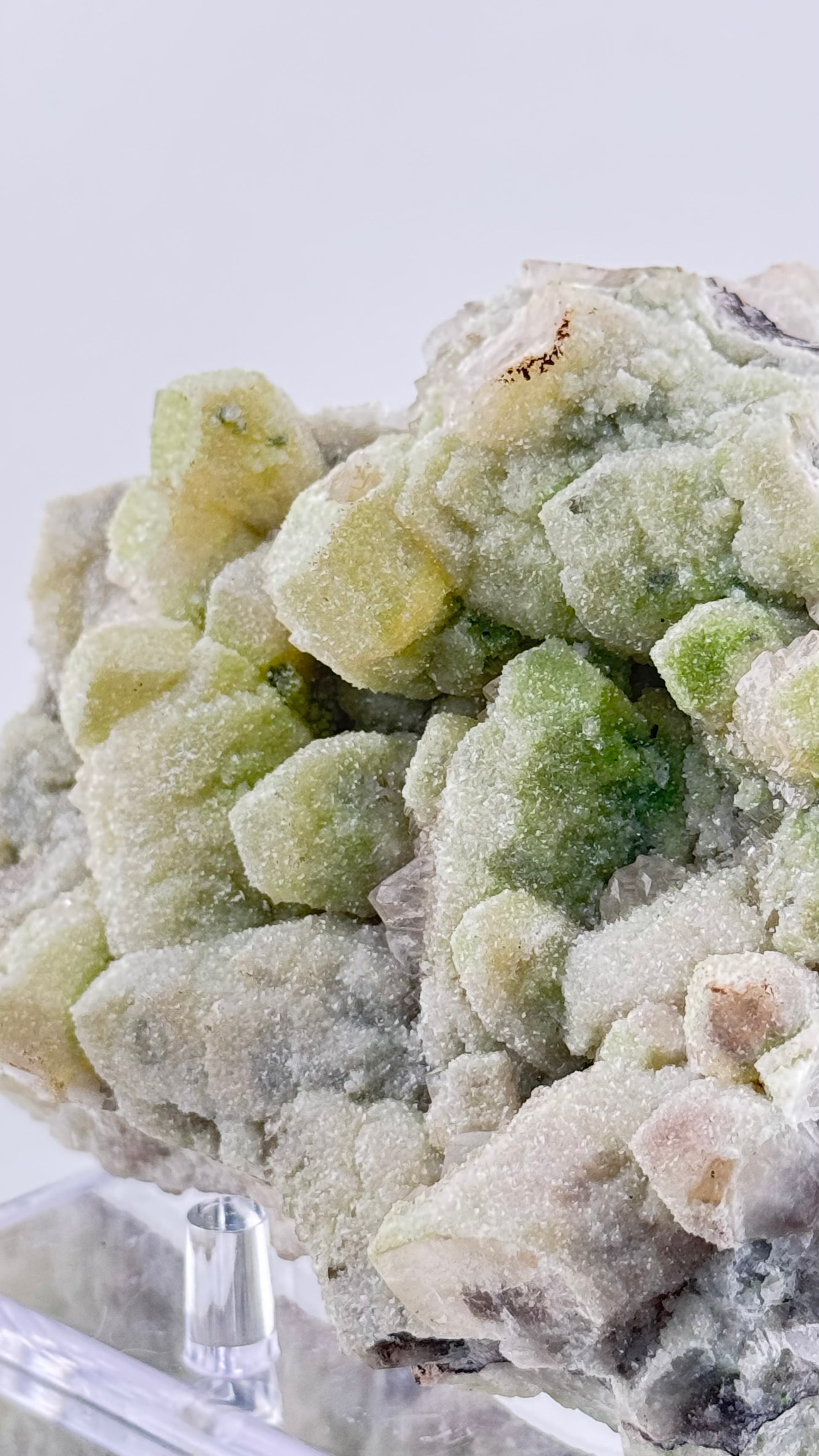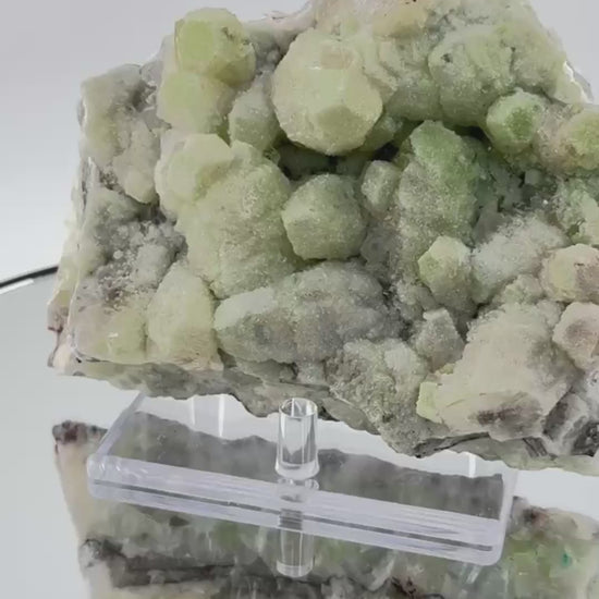 Die Stufe wird auf einem transparenten Acryl-Ständer präsentiert, der die dreidimensionale Struktur der Duftit-Kugeln optimal zur Geltung bringt. Die erhöhte Position ermöglicht Betrachtung von allen Seiten und lässt die grünen Formationen frei erscheinen.