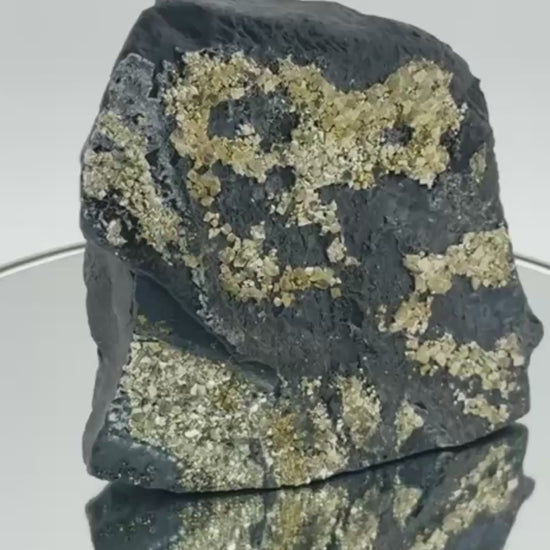 Ideal for collectors of rare rocks, lovers of geological contrasts, or as a sculptural decorative object. The combination of 2-billion-year-old carbon and metallic pyrite, the unique location of its discovery, and the dramatic black and gold contrast make this piece a special collector's item from Russia.