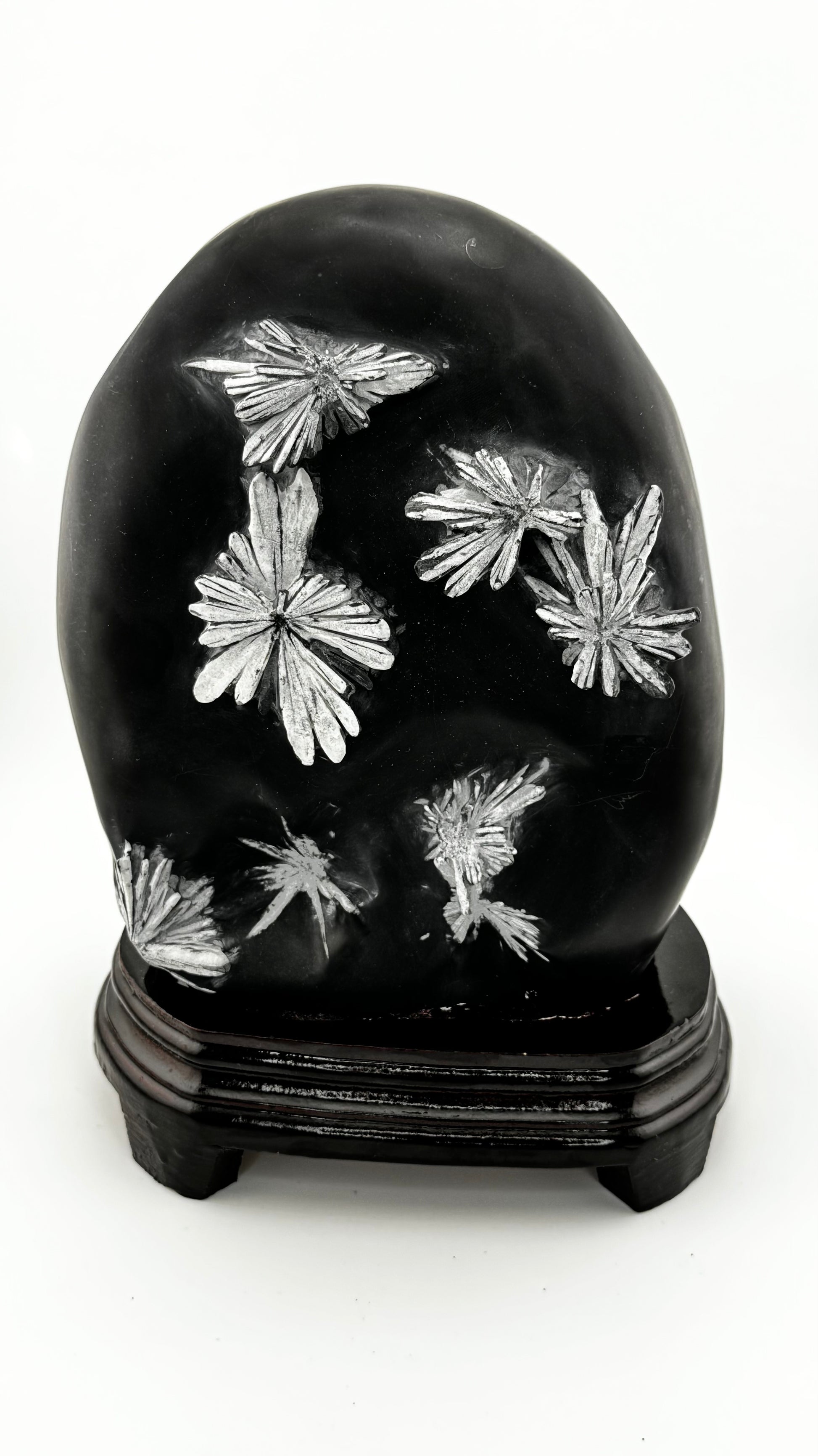 The polished black quartz background has been precisely worked to optimally showcase the natural stibnite rosettes. The smooth, reflective surface contrasts with the three-dimensional, metallic crystals, creating an effect reminiscent of East Asian lacquerware or silk embroidery. This combination of natural crystallization and human craftsmanship makes the “Chrysanthemum Stone” a liminal object between nature and art.